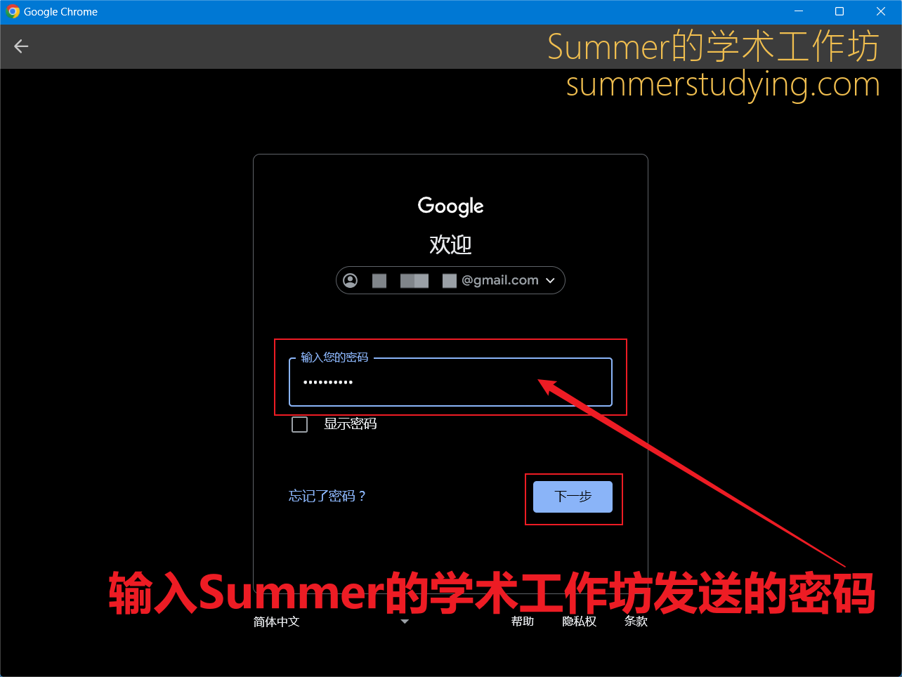 3.4输入Summer的学术工作坊发送的账号(以@gmail.com为结尾),再点击下一步